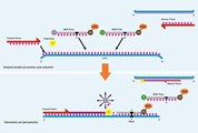 Die Taq Polymerase synthetisiert einen komplementäre DNA-Strang, indem sie die PCR Primer als Leitfaden nutzt. Sobald die Polymerase die MGB-Sonde erreicht, spaltet ihre 5' Nuklease Aktivität die Sonde und trennt den Farbstoff vom Quencher.