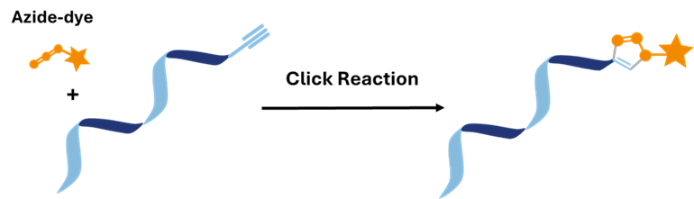 baseclick’s approach involves incorporating alkyne- or azide -modified nucleotides (e.g., EATP, 2’N3-2’-ATP) into the poly-A tail, which can then be conjugated with azide- or alkyne-containing molecules, such as fluorescent dyes or targeting ligands, without affecting mRNA functionality.